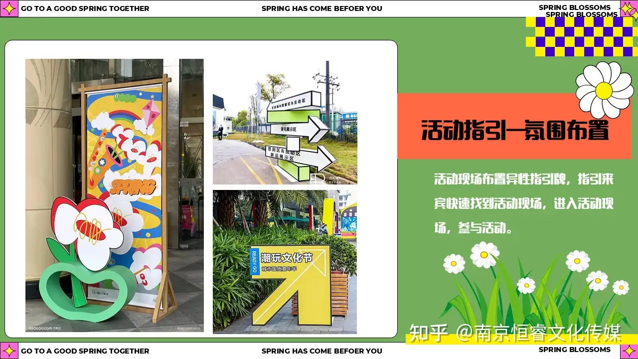 主题背景板传递信息:布置主题背景板,上面不仅有活动的相关信息,还可能展示与春天、花朵相关的元素和图案。背景板既可以作为活动的标志性景观,让来宾拍照打卡,也能释放项目信息,让大家进一步了解活动背后的项目。